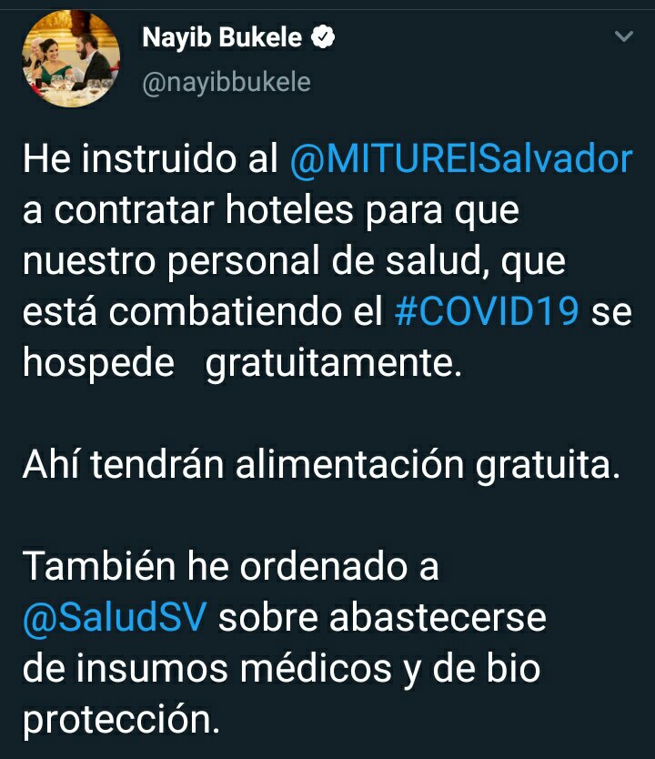 «He instruido al @MITURElSalvador a contratar hoteles para que nuestro personal de salud, que está combatiendo el #COVID19 se hospede gratuitamente.