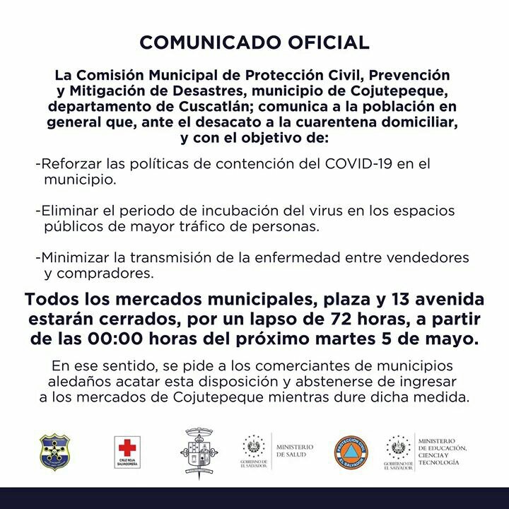 La Comisión Municipal de Protección Civil, Prevención y Mitigación de Desastres, municipio de Cojutepeque, departamento de Cuscatlán; comunicó a la población en general que, ante el desacato a la cuarentena domiciliar, todos los mercados municipales, plaza y 13 avenida estarán cerrados, por un lapso de 72 horas, a partir de las 00:00 horas del próximo martes 5 de mayo.