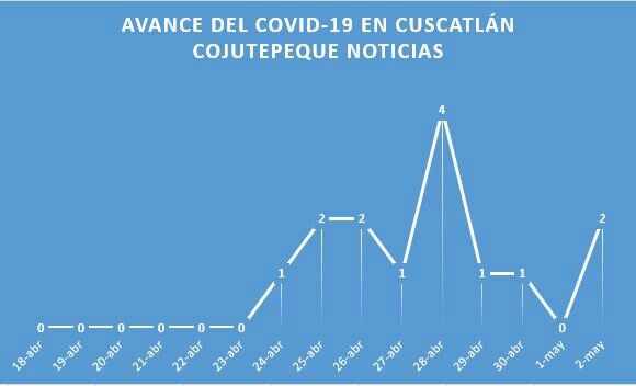 Gráfica 1: En gráfica podemos ver el desarrollo de la curva de casos por COVID-19 en Cuscatlán desde el 17 de abril, con el primer caso en el municipio de El Carmen, hasta el 2 de mayo.